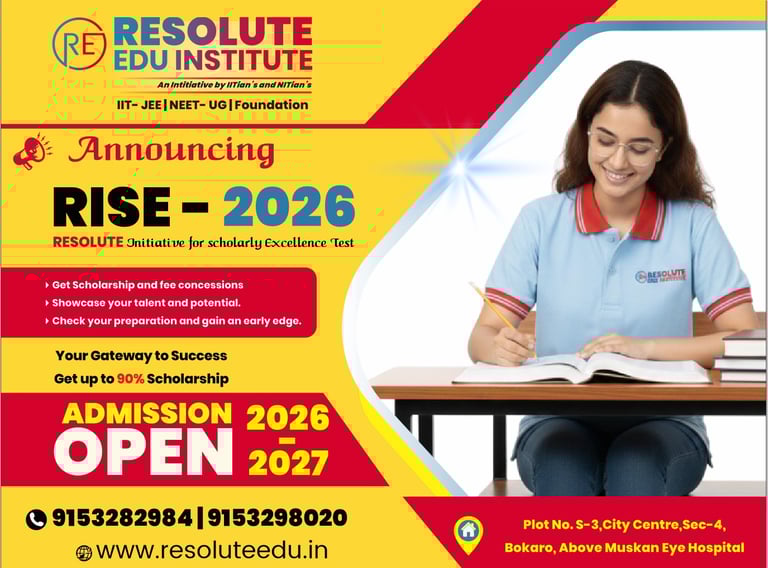 Resolute's Initiative for Scholarly Excellence Test-RISE For Academic Session 2026-"Resolute Edu Institute proudly presents the RISE 2026 Scholarship Test, an incredible opportunity for students seeking admission to Classes 8th to 12th and 12th pass aspirants. This scholarship test offers students a chance to secure substantial financial aid while receiving Top-class education in Bokaro and academic mentorship. RISE 2026 is designed to identify and support talented students, helping them unlock their full potential and achieve academic excellence. Don't miss this opportunity to rise above the restβ€”apply now and take your first step towards a brighter future!"